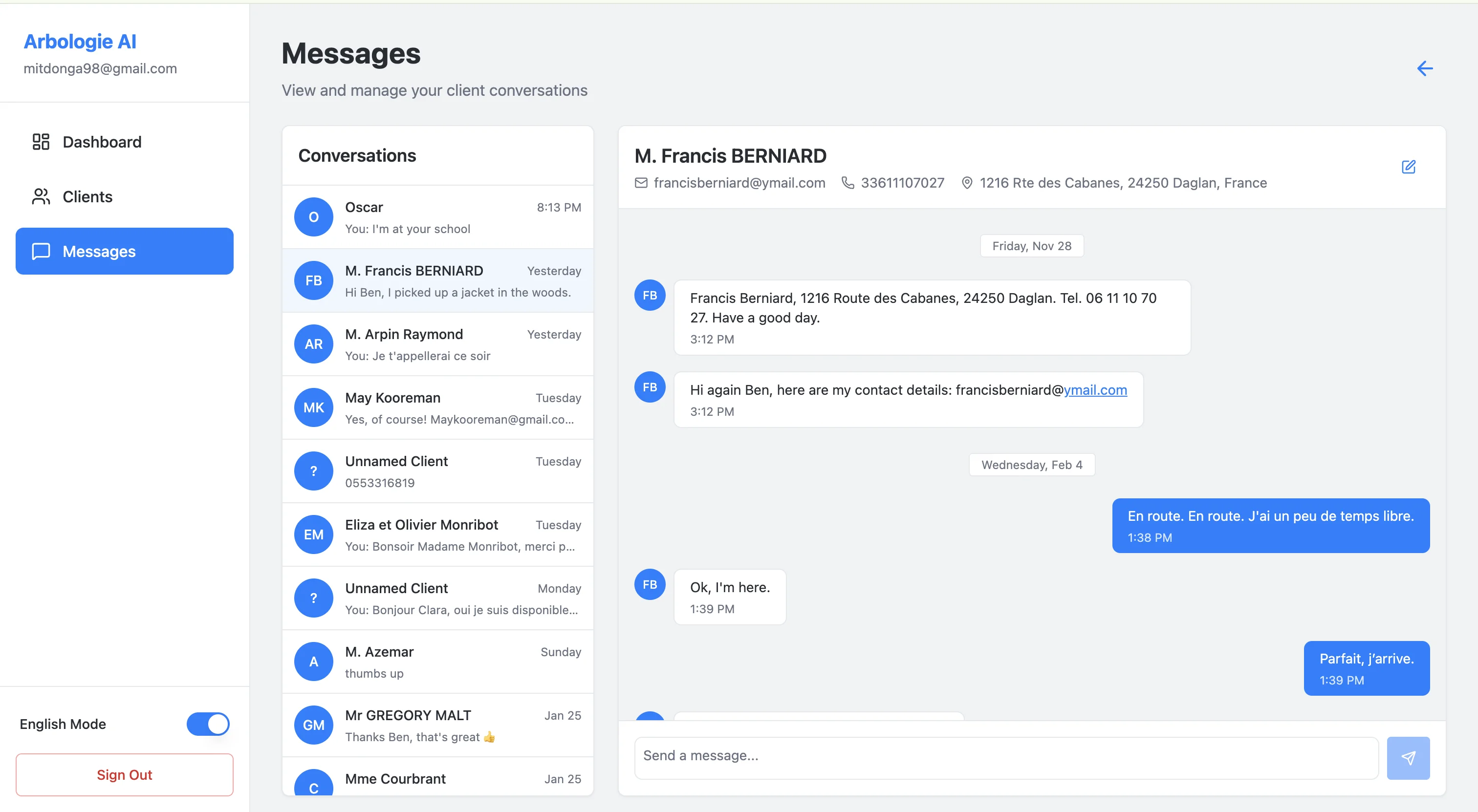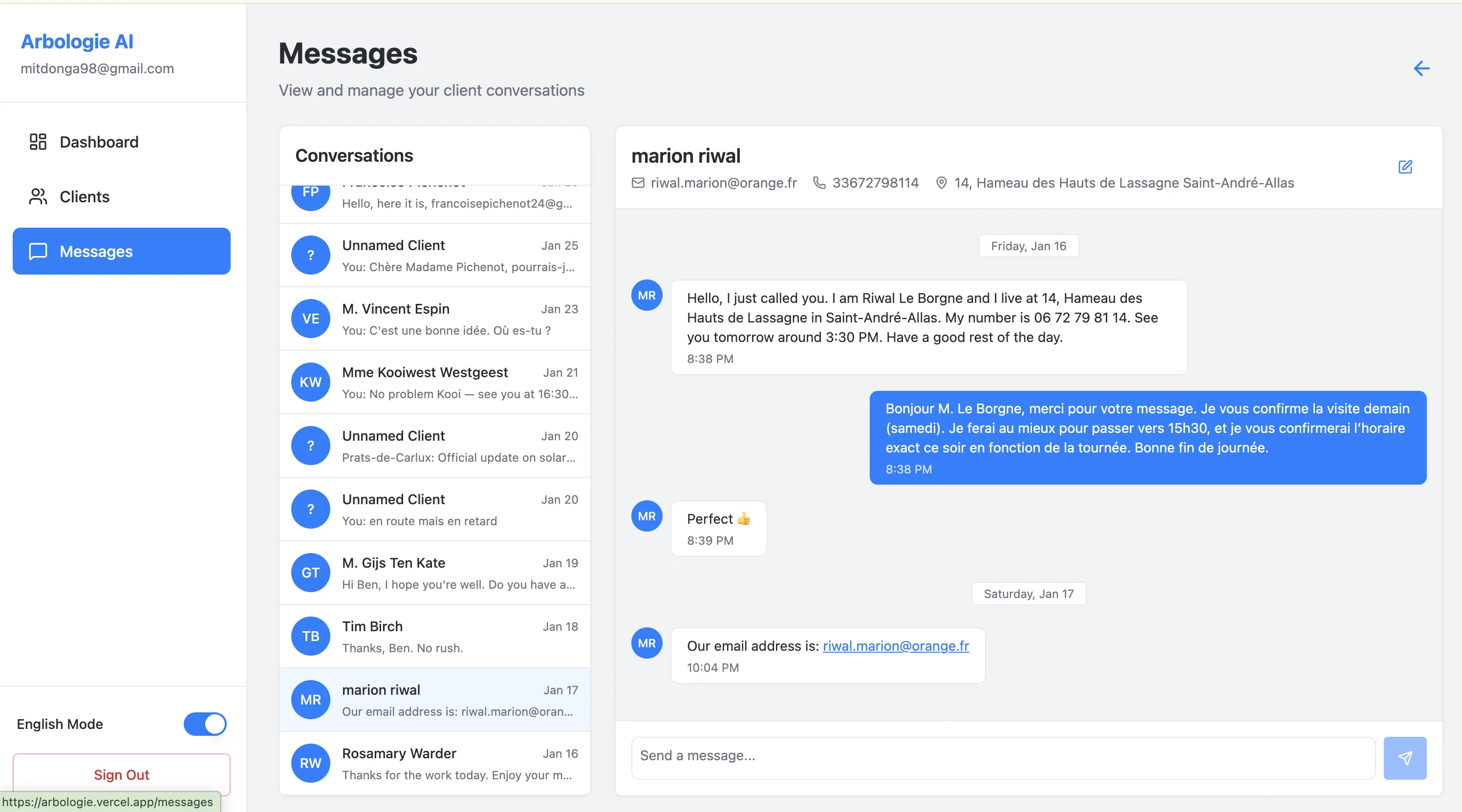Custom AI-powered personal assistant system for arborist business operations. Developed intelligent agents capable of autonomously handling appointment bookings, customer inquiries, and client communication. Built comprehensive full-stack platform providing unified client management and communication interface to streamline business workflows.